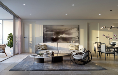 Featuring a refined palette of natural materials, the open living spaces provide a warm counterpoint to the soaring ceilings and full-height windows. Custom herringbone floors and hand-selected stone bring a rich tactility to the rooms.